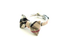 ベージュ地に黒とワインレッドのラインが入った上品なノバチェック柄のリボン首輪です。