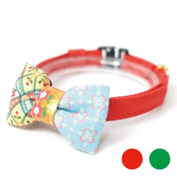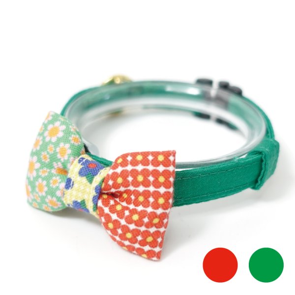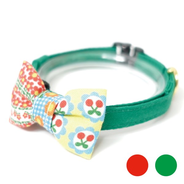 リボンの左右で柄が違う、遊び心のあるデザイン!リボンが映えるレッドとグリーンの首輪!