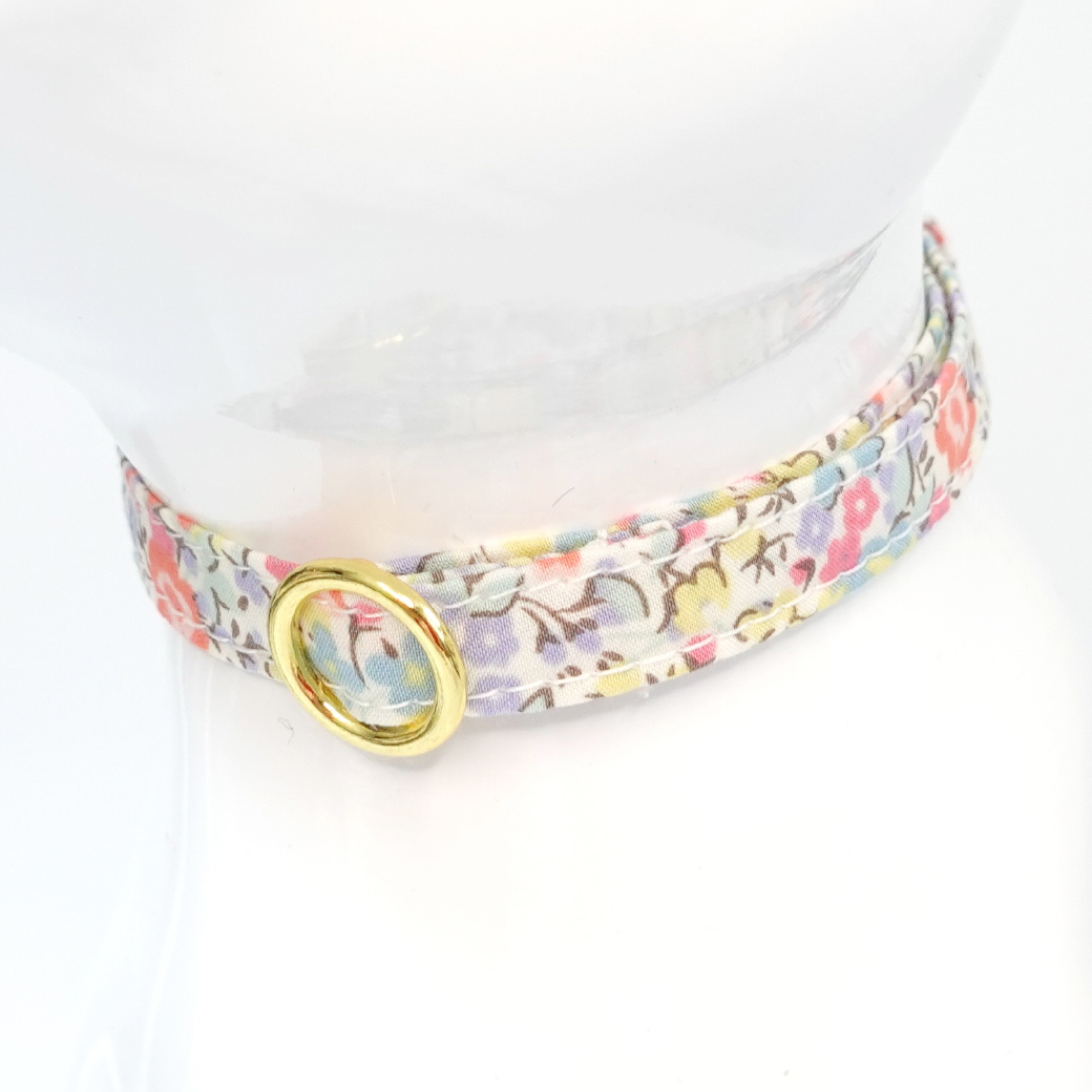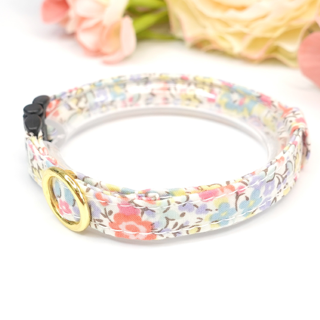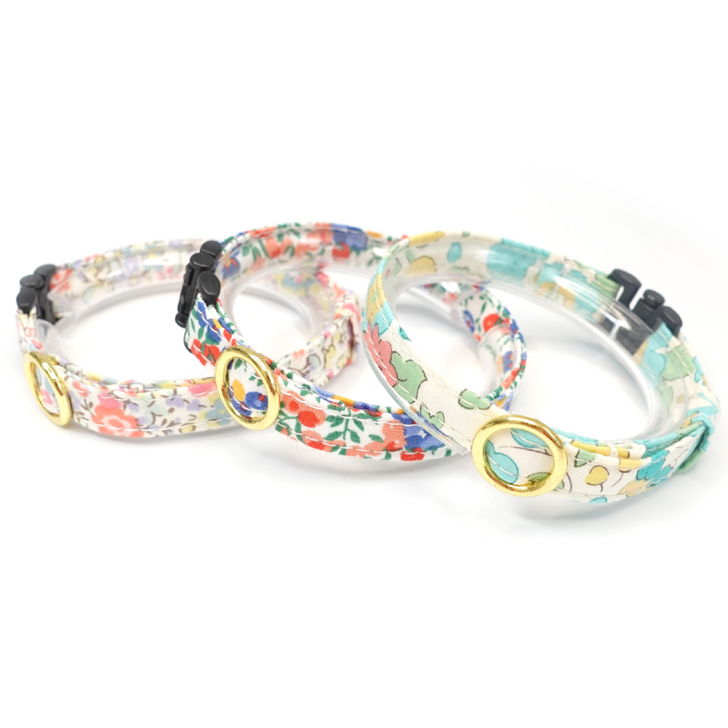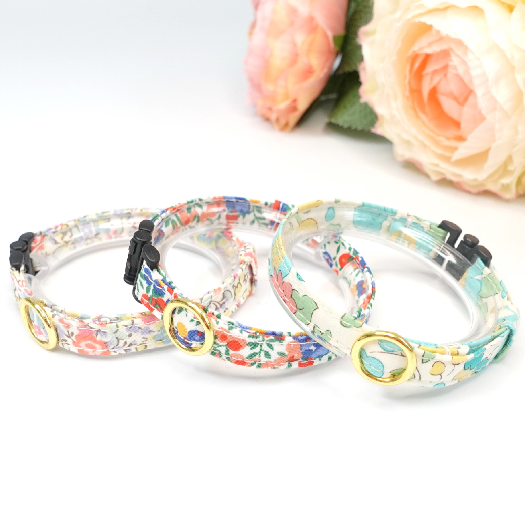リバティ・ファブリックスで製作している猫首輪です。国内で手作りされたエレガントな猫用首輪です。