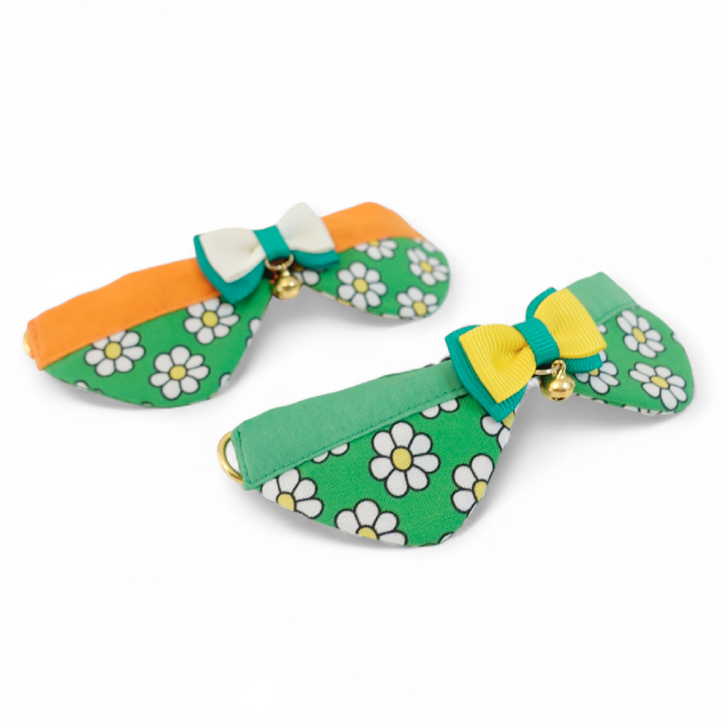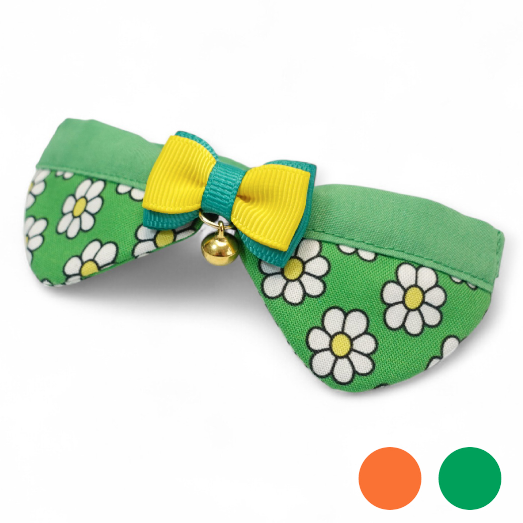 リボンチャーミー衿付首輪&鈴付きダブルリボン(レトロなお花さんグリーン)オレンジ・グリーン2色展開 [チャーミー4]