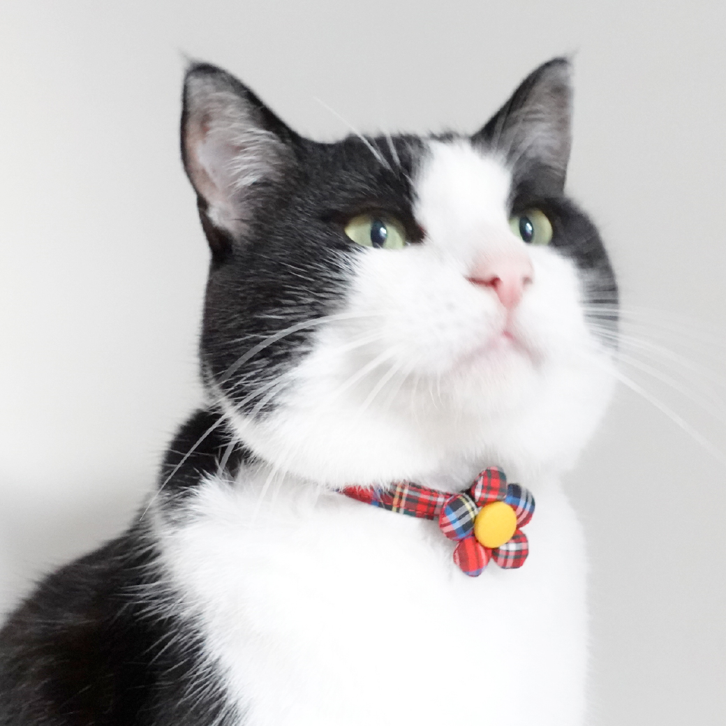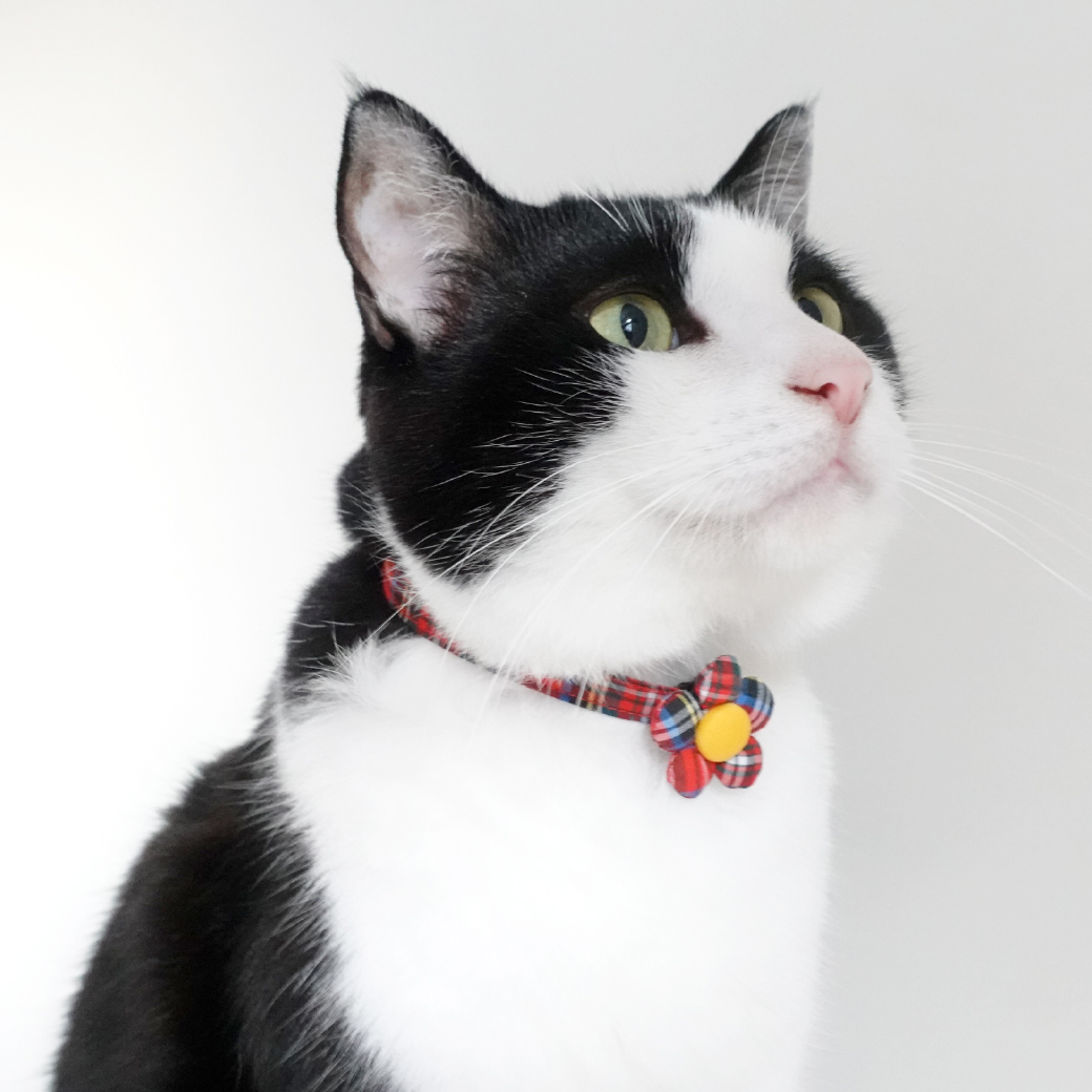 お花の大きさは何度も試作を繰り返し、猫ちゃんの顔の下で映える絶妙なサイズに設計しました。生地の配色も可愛いお花の首輪。ぜひ、おめかししてくださいね♪