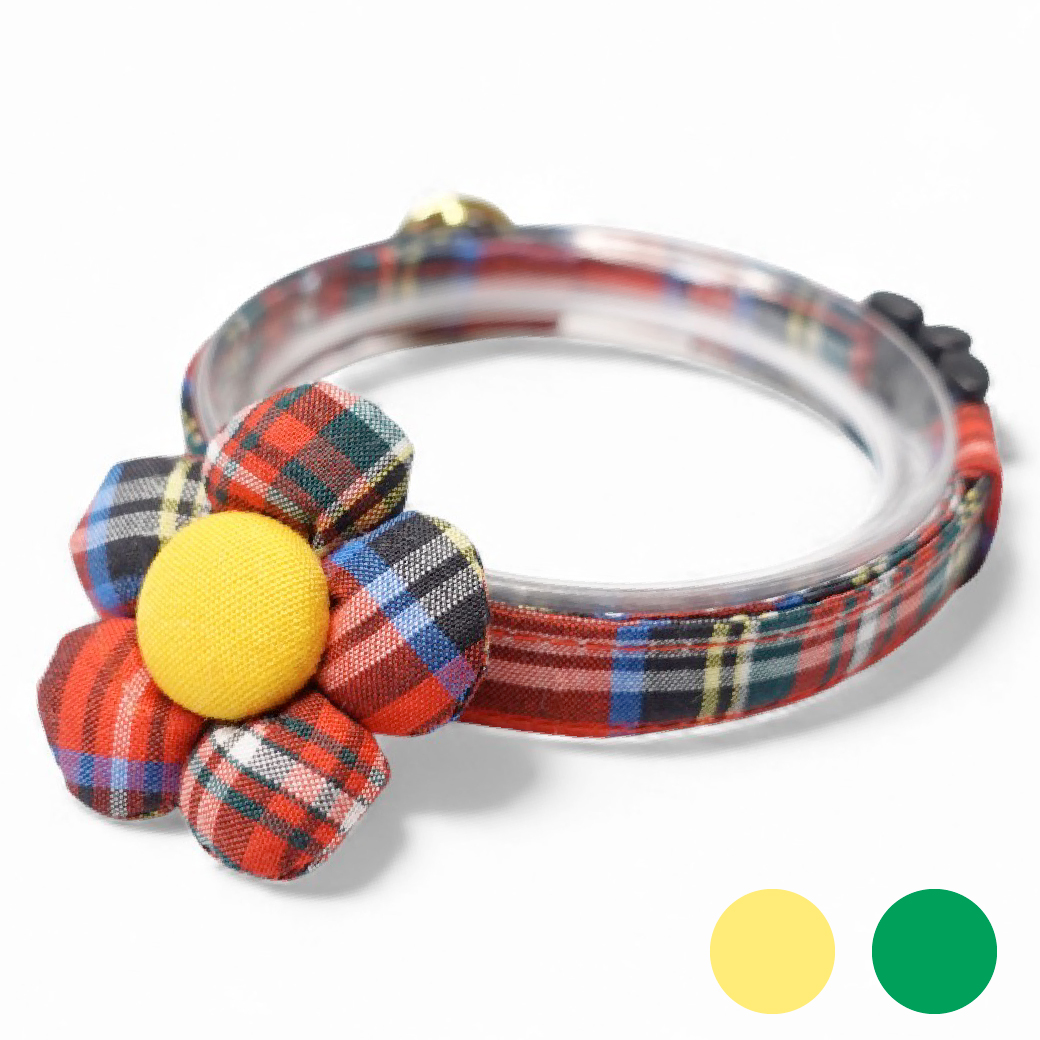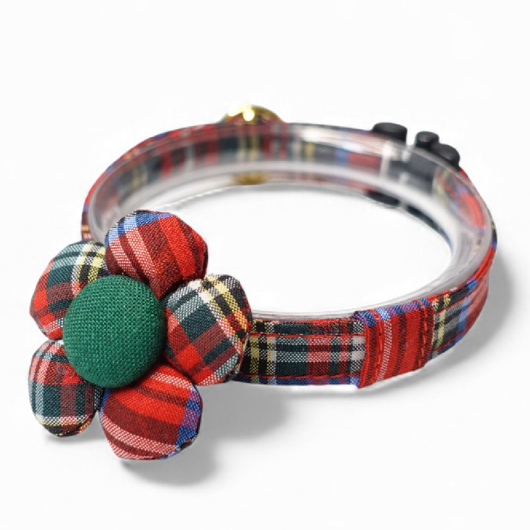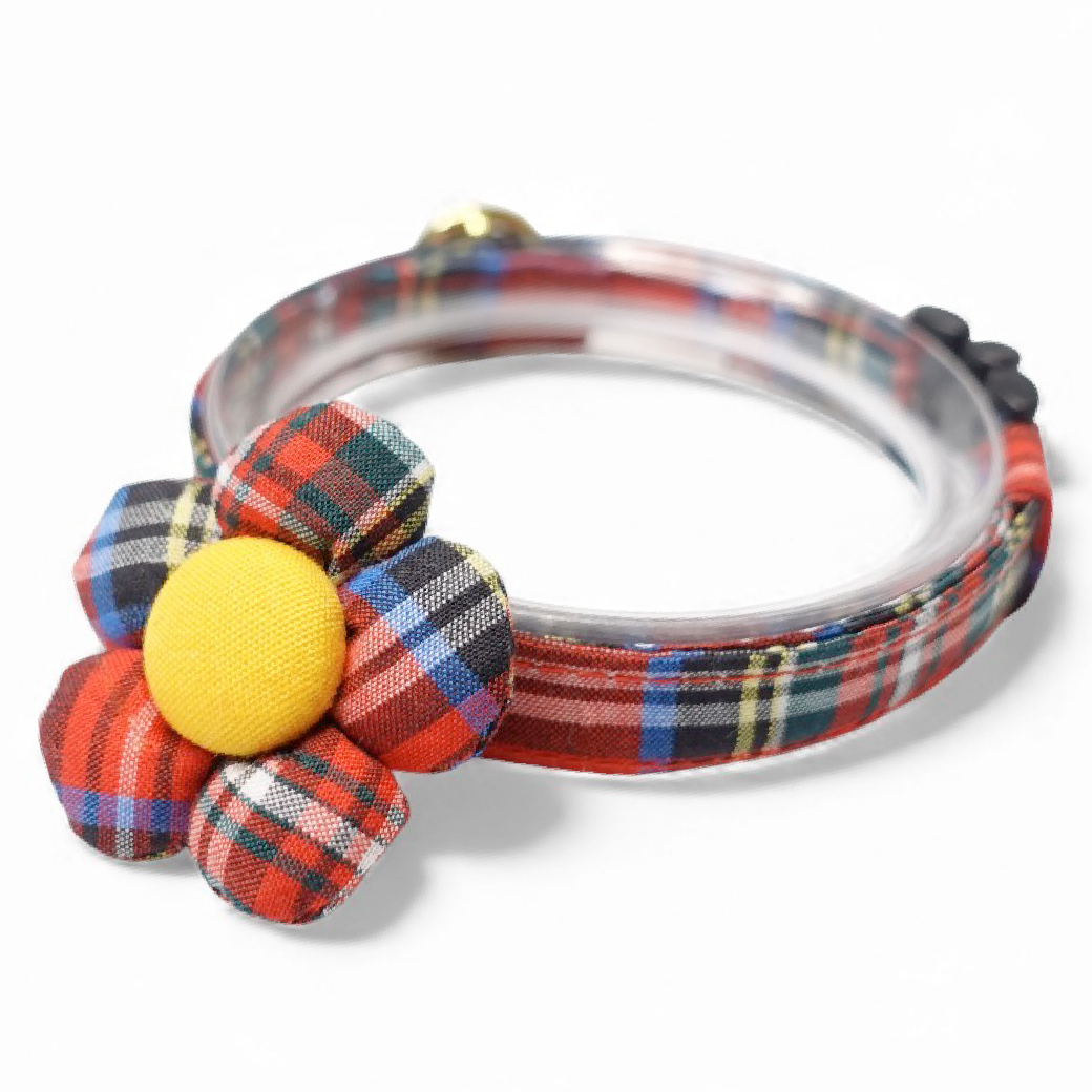 赤のタータンチェックの花びらに無地のカラー配色をしたお花モチーフ付の首輪です5枚の花弁を職人が一枚一枚縫って作っています。