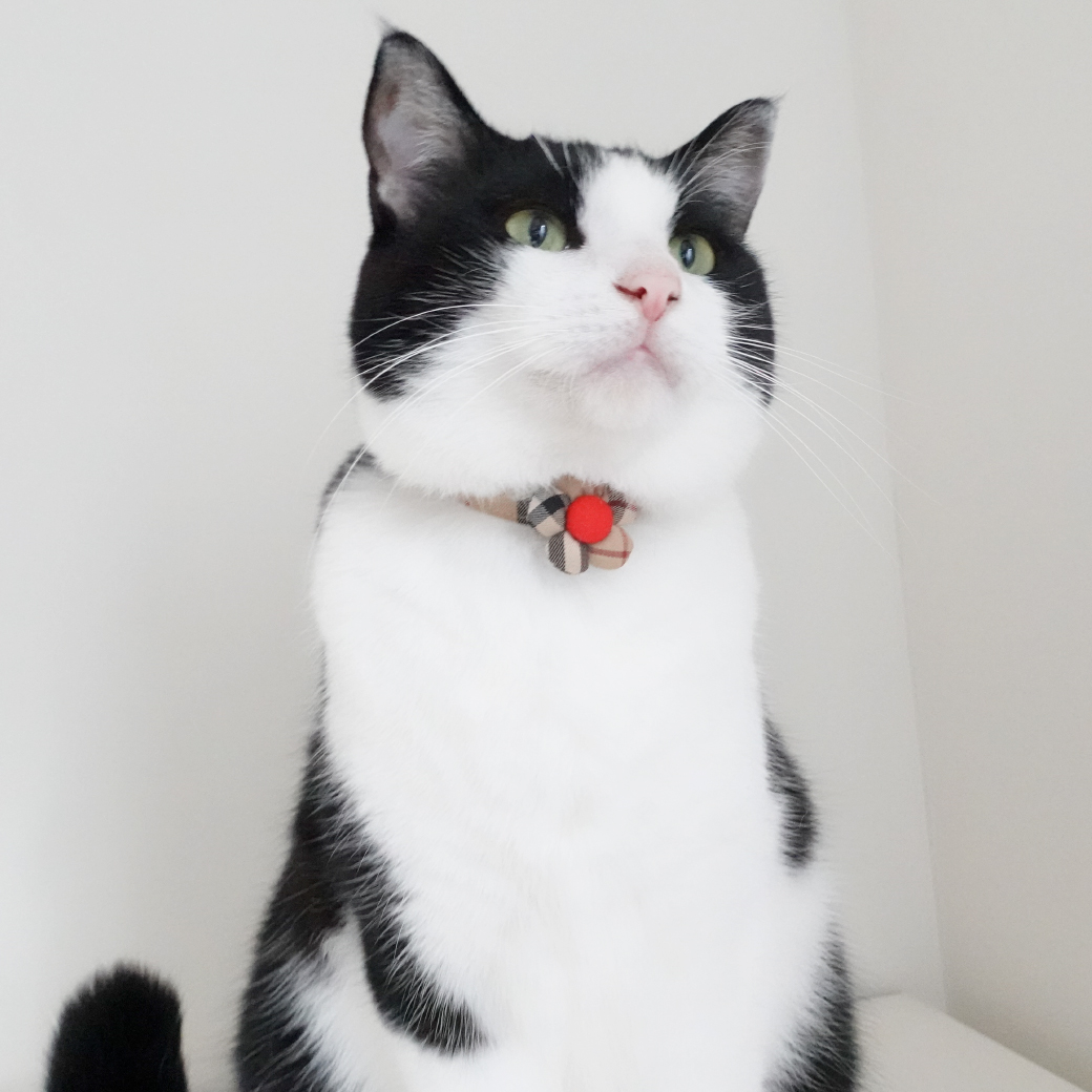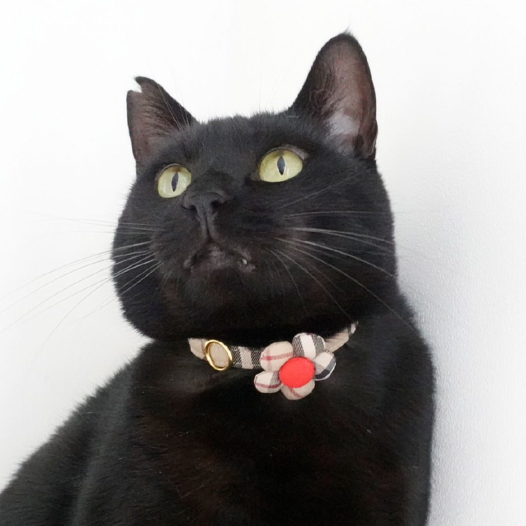 お花の大きさは何度も試作を繰り返し、猫ちゃんの顔の下で映える絶妙なサイズに設計しました。生地の配色も可愛いお花の首輪。ぜひ、おめかししてくださいね♪