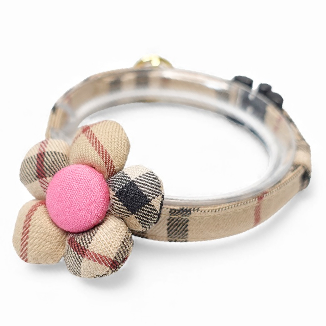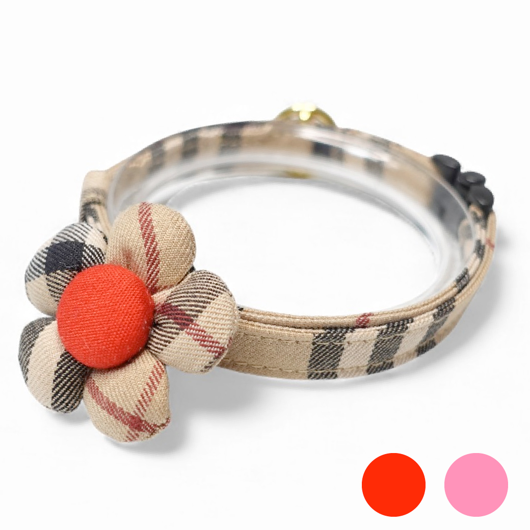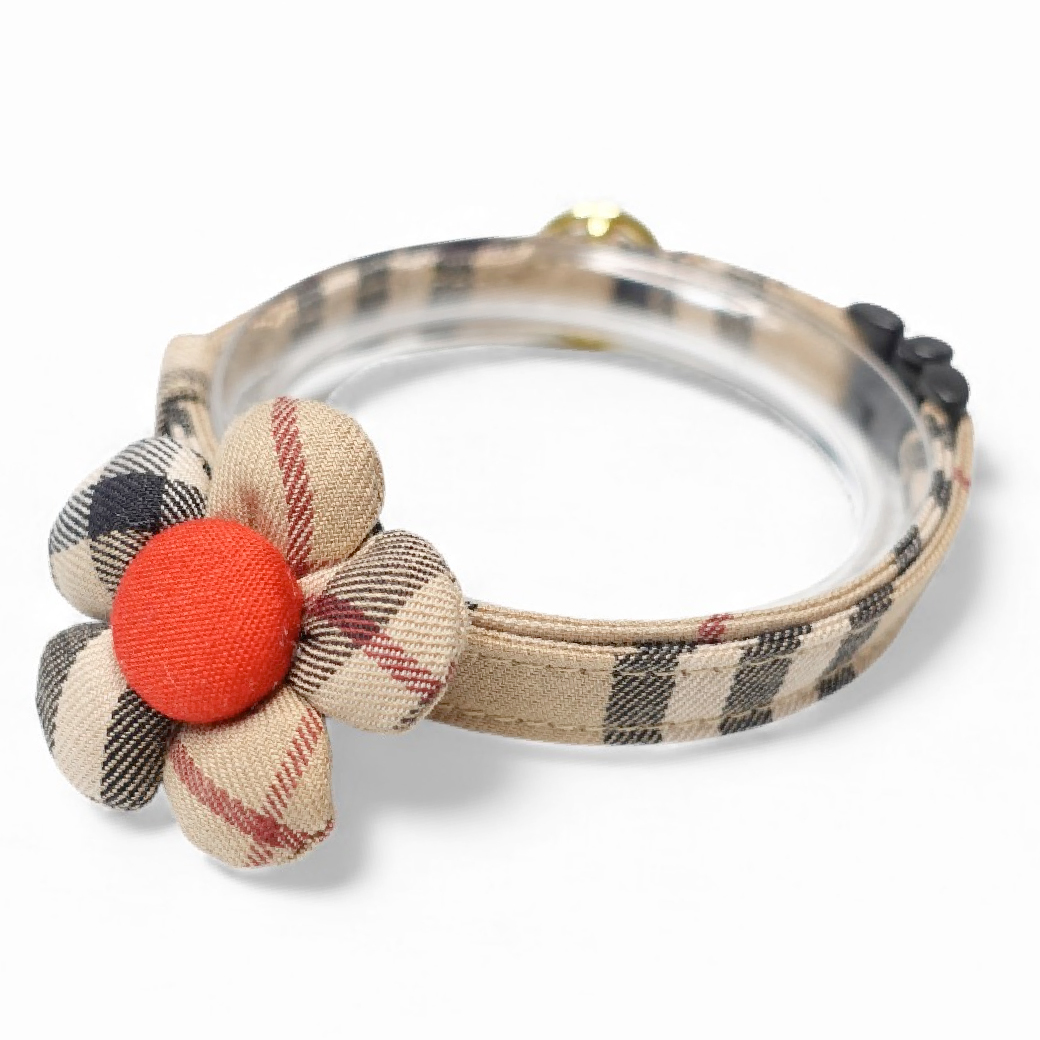 ベージュ×ブラック×ワインレッドのクラシカルチェックの花びらに無地のカラー配色をしたお花モチーフ付の首輪です。5枚の花弁を職人が一枚一枚縫って作っています。