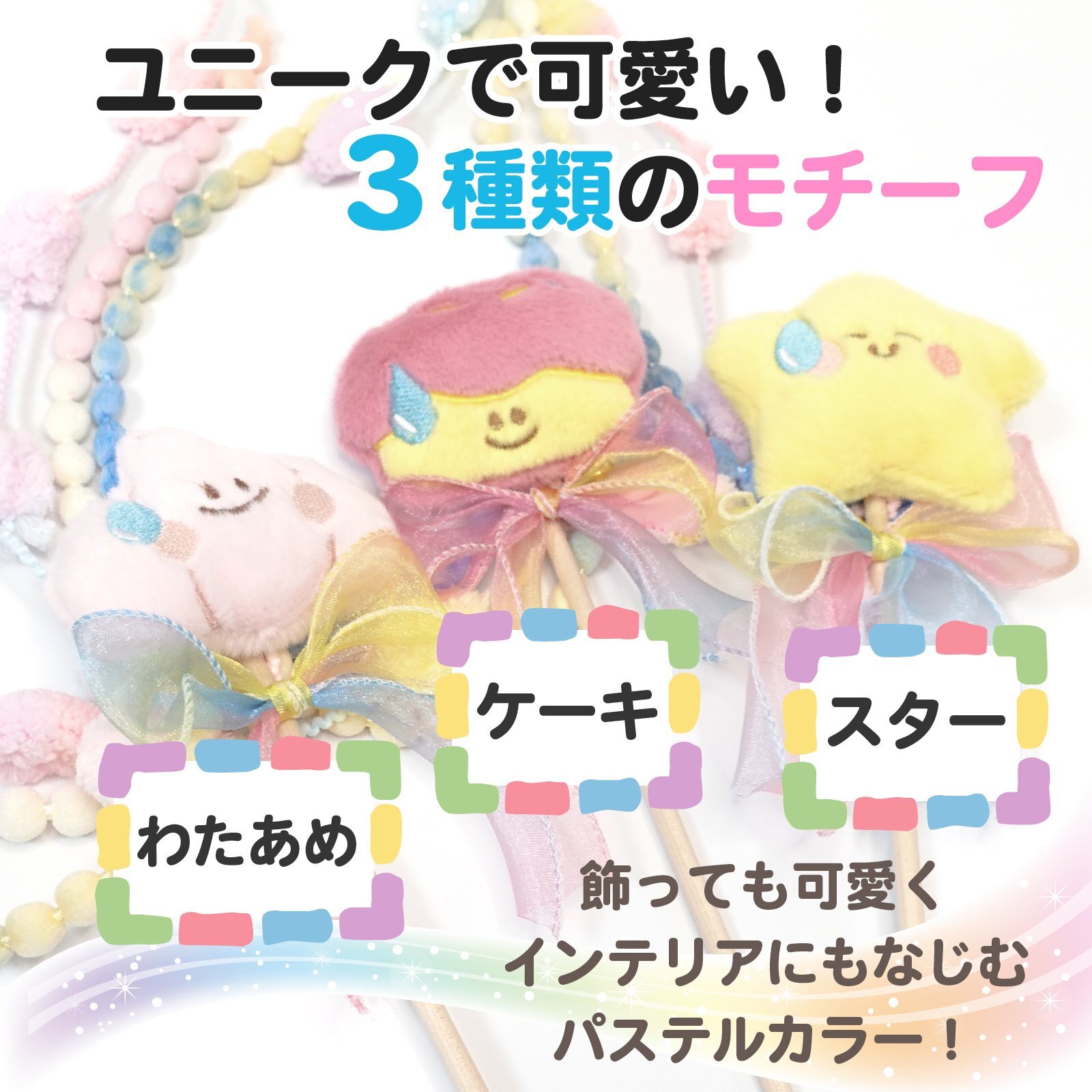 2️⃣ 【星・ケーキ・わたあめの可愛いモチーフ】 ユニークで可愛い3種類のモチーフが猫の好奇心を刺激! 飾っても可愛く、インテリアにもなじむパステルカラー。