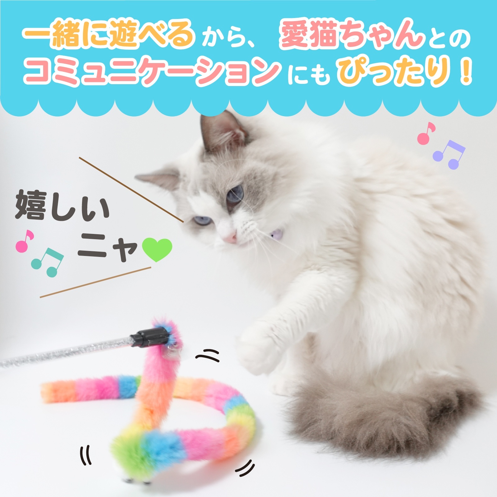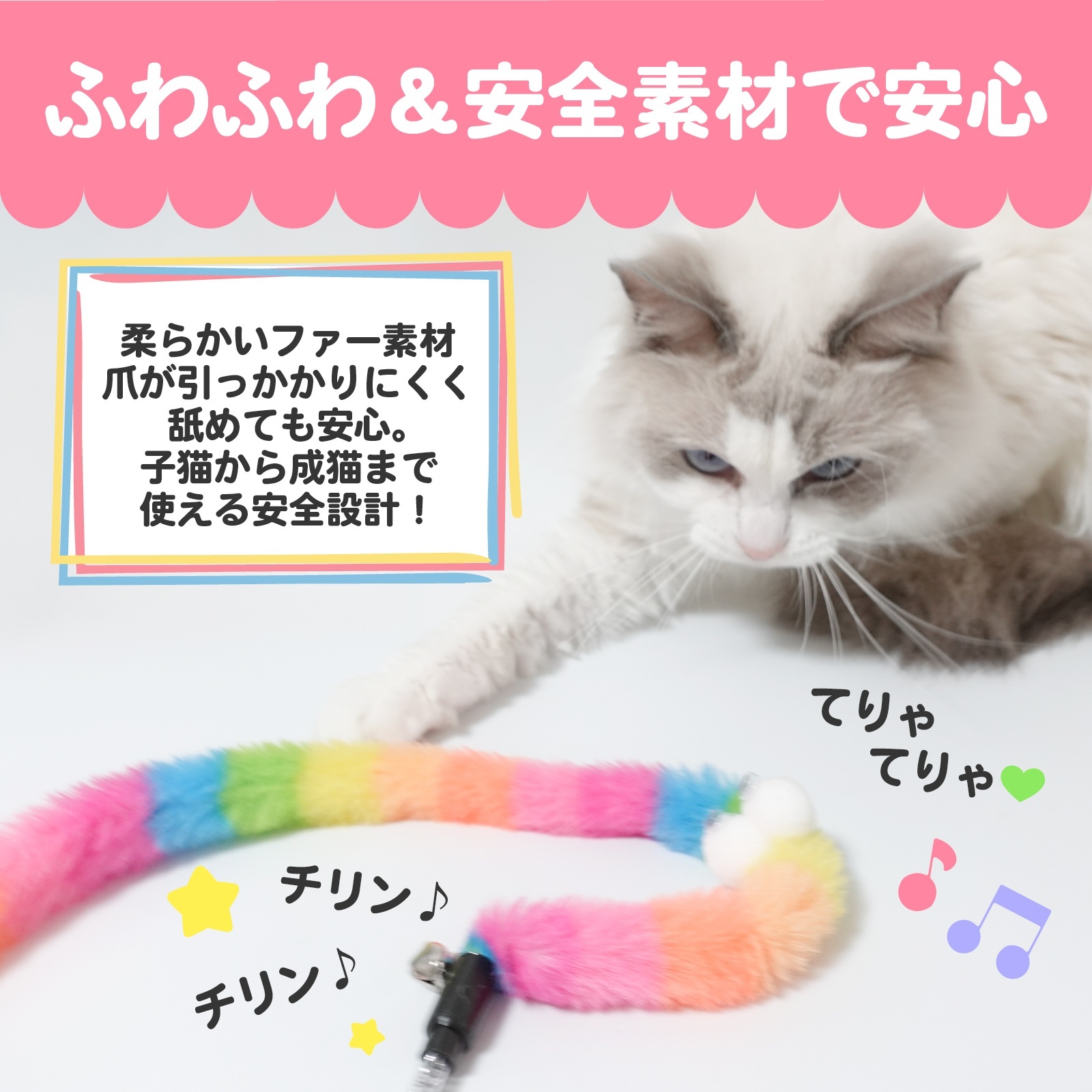 5️⃣ 【かわいい2色展開&癒し時間をプレゼント】 レインボー&パステルの2色。見た目も可愛く、愛猫との絆を深める癒しのおもちゃです