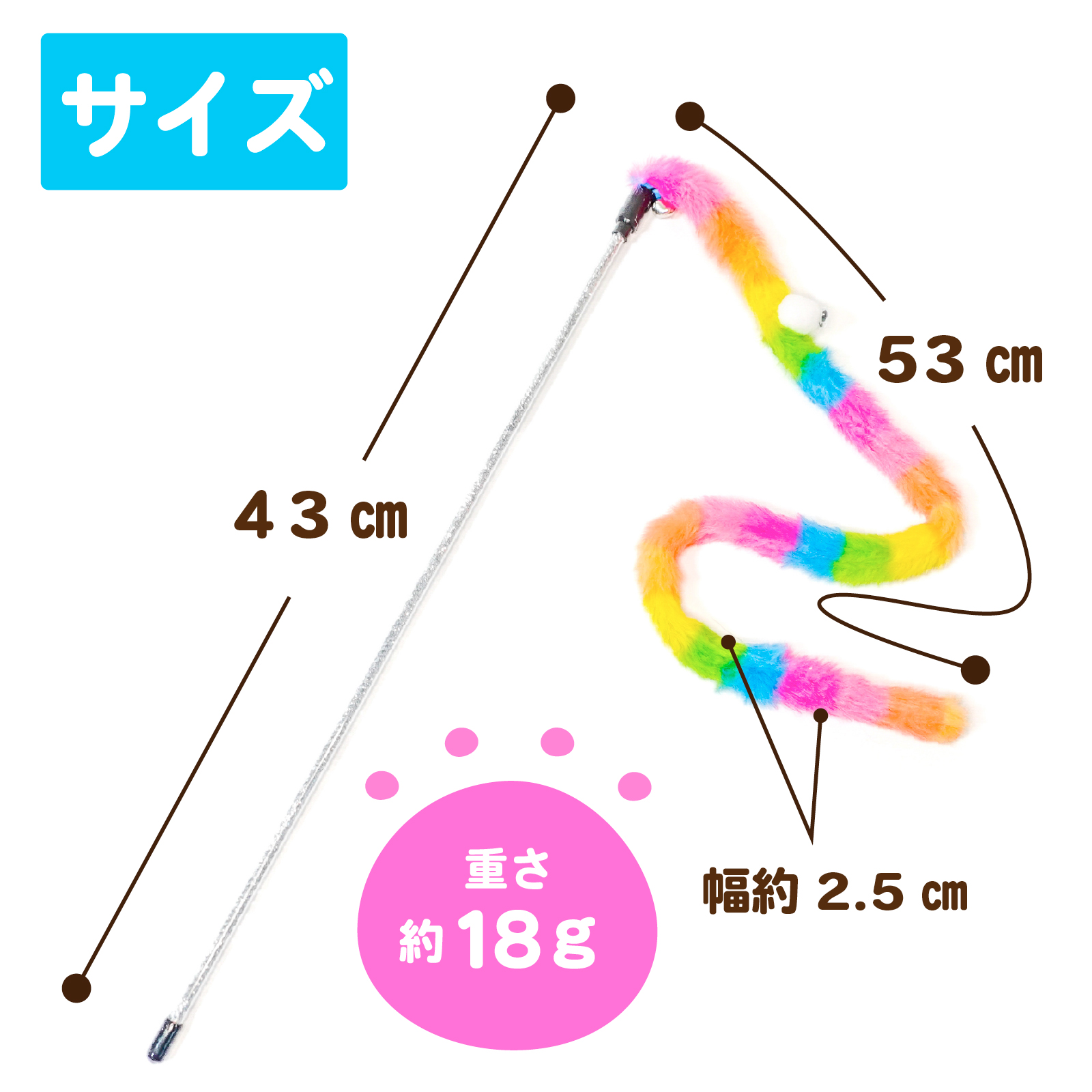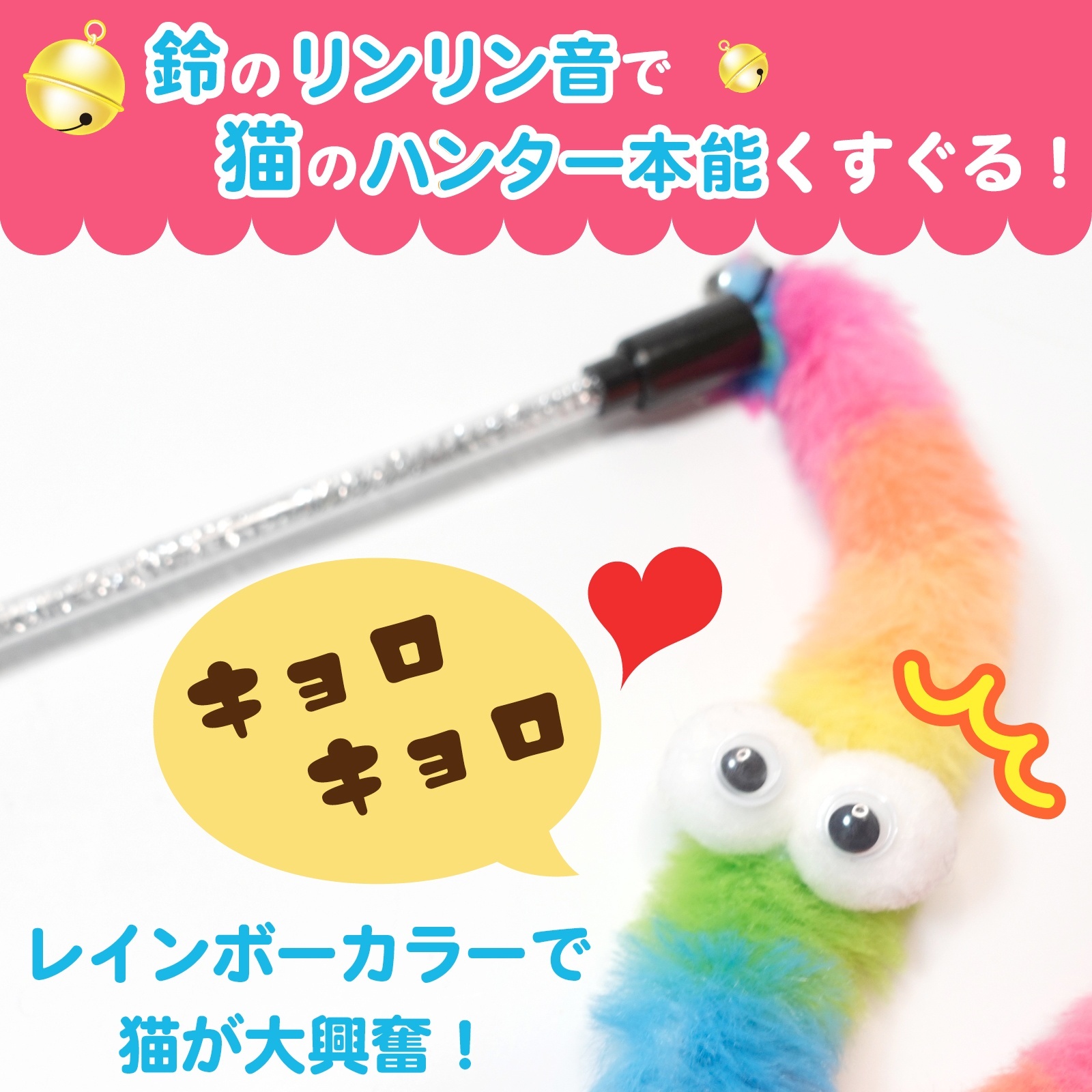 ふわふわカラフルなにょろにょろが動くたびに、猫のハンター本能を刺激!明るい色合いが視覚的にも楽しく、遊ぶ姿がとっても可愛い猫じゃらしです。