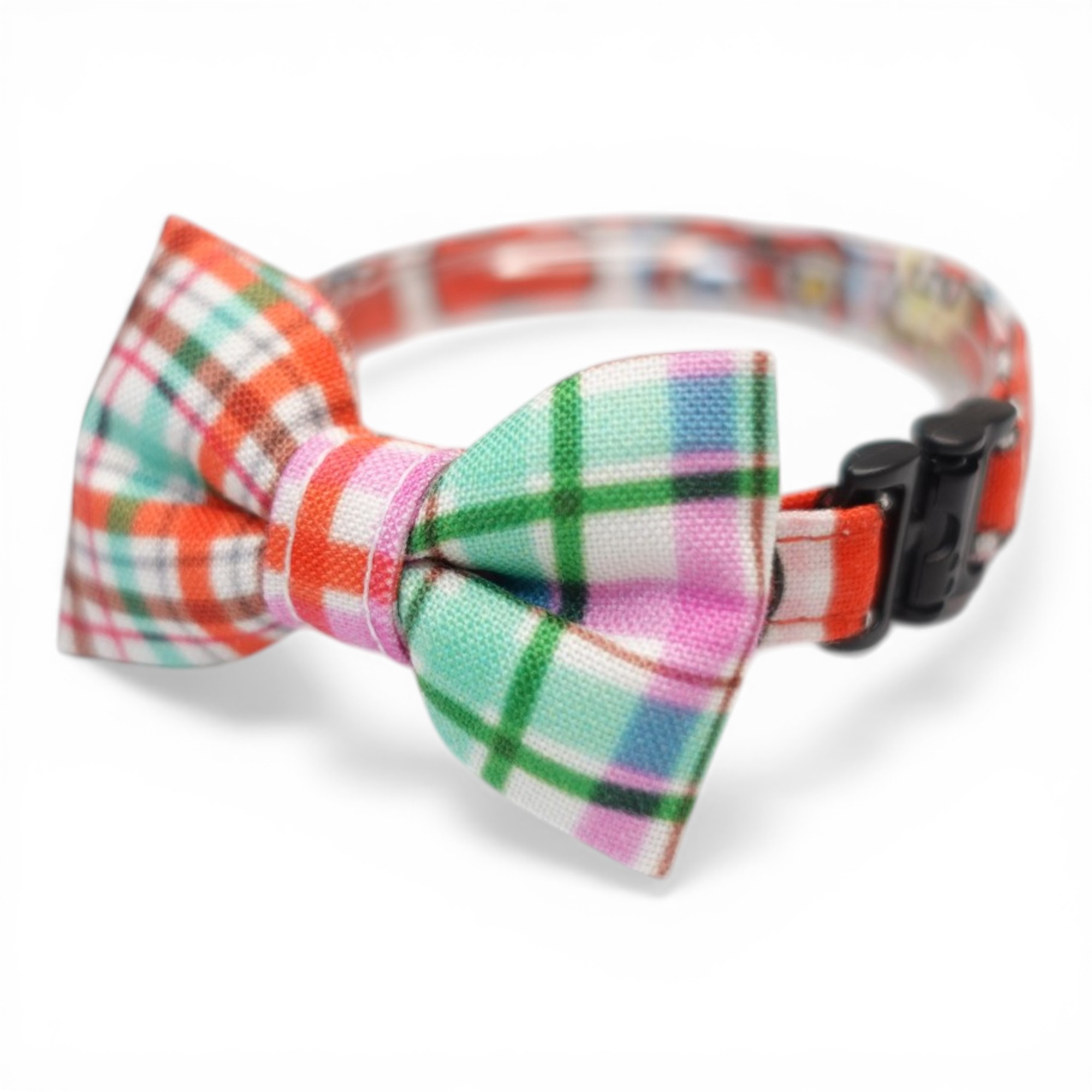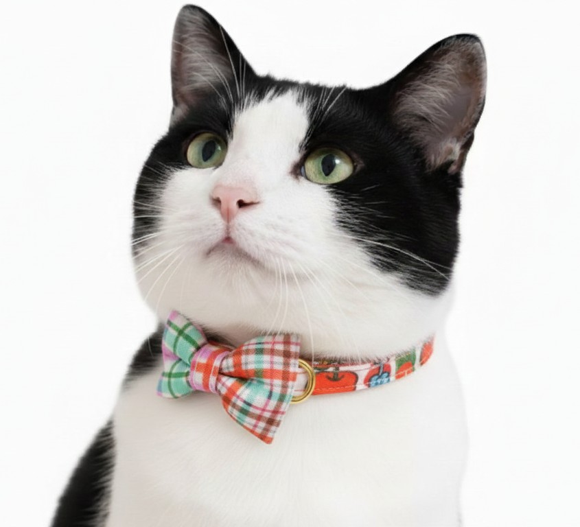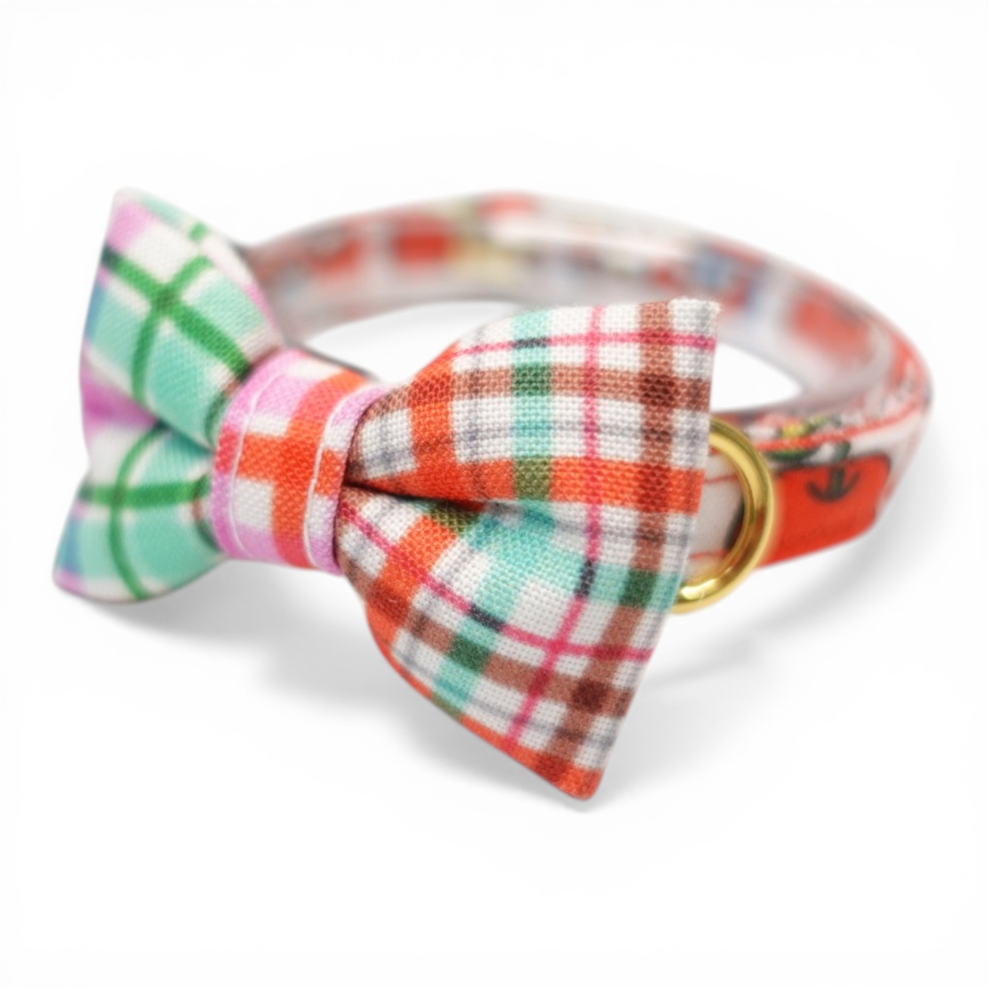 - > 世界にひとつの組み合わせ|レトロリンゴ×手書きチェック 左右で柄が異なるリボン首輪【限定1点】J柄