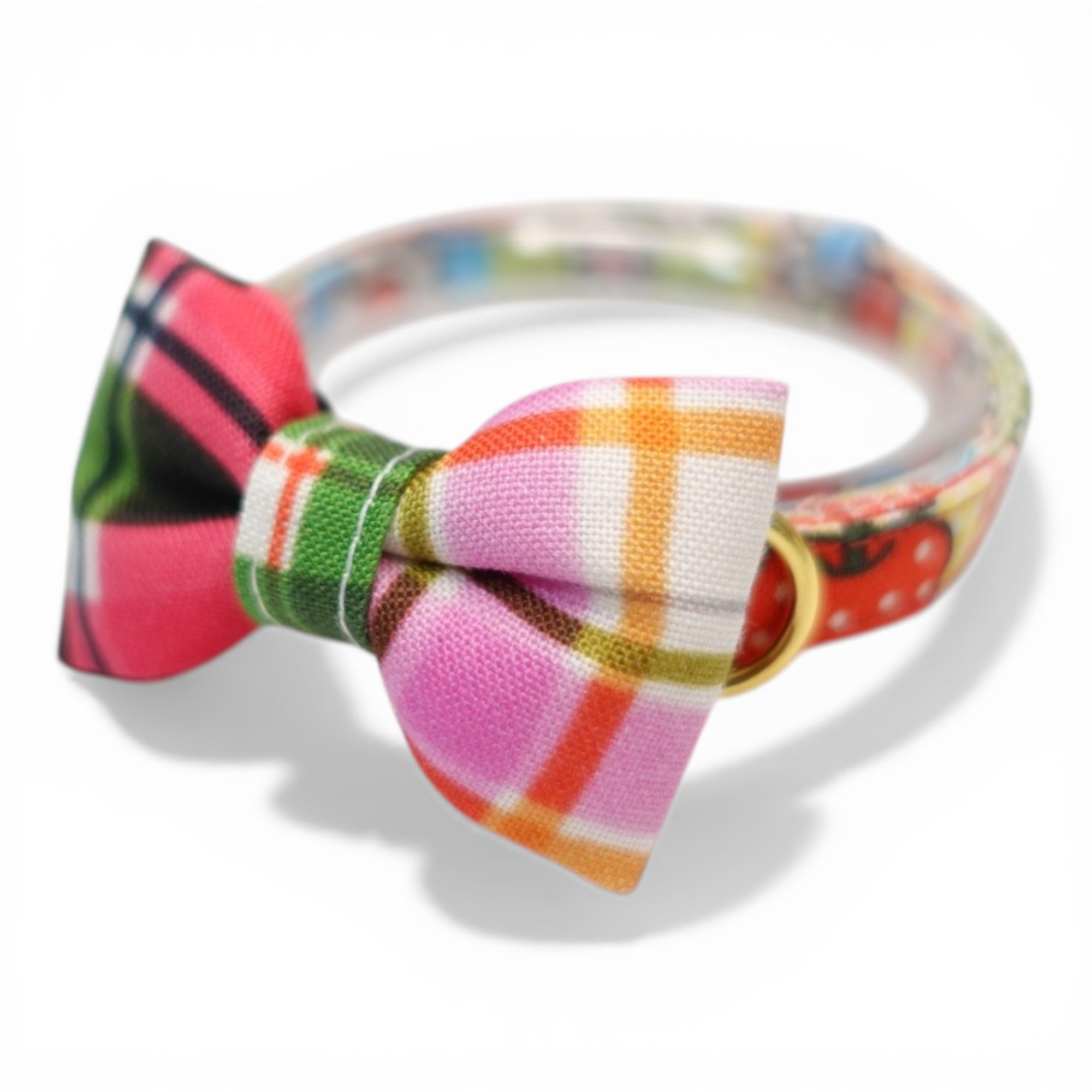 - > 世界にひとつの組み合わせ|レトロリンゴ×手書きチェック 左右で柄が異なるリボン首輪【限定1点】K柄