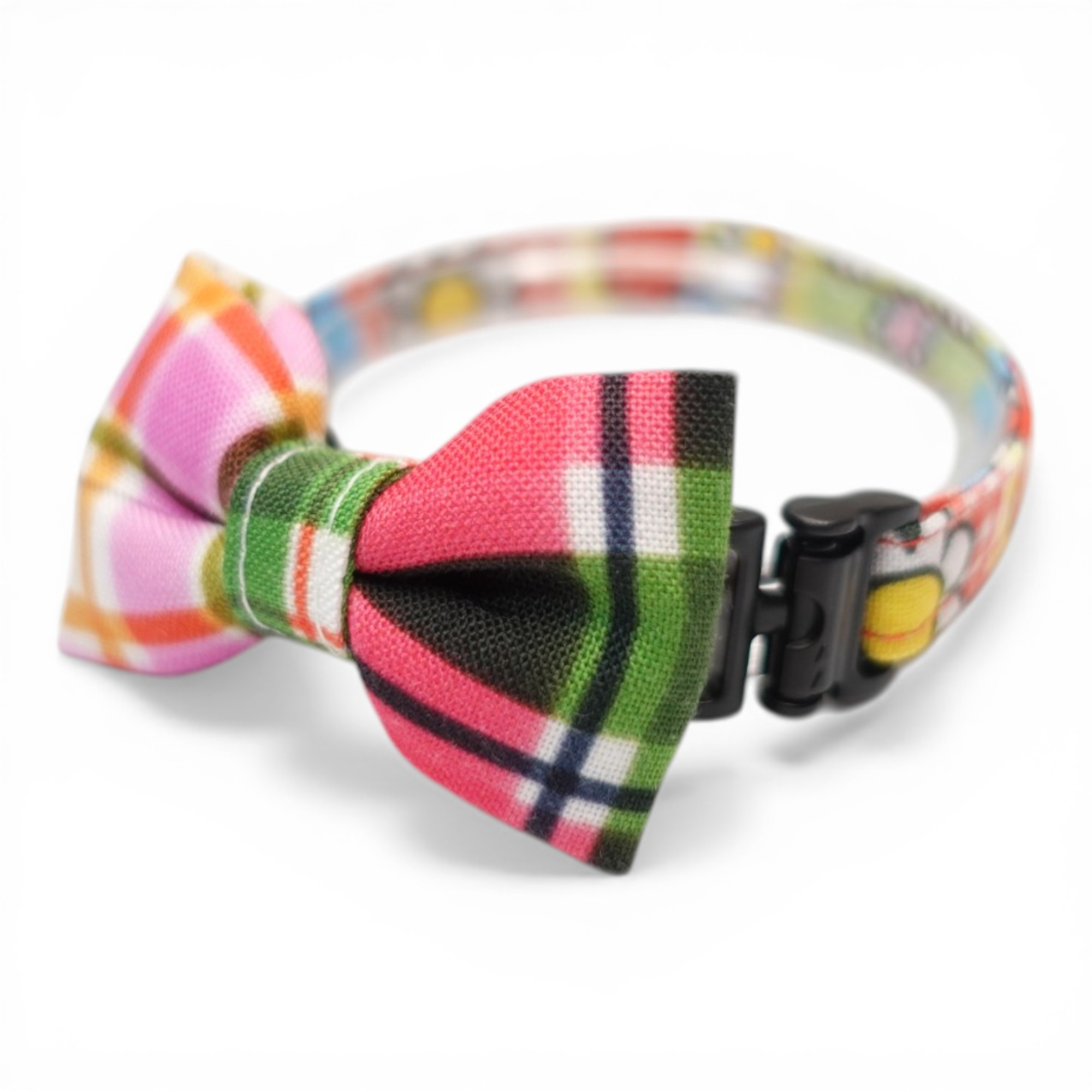 世界にひとつの組み合わせ|レトロリンゴ×手書きチェック 左右で柄が異なるリボン首輪【限定1点】K柄 [patchwork-10]
