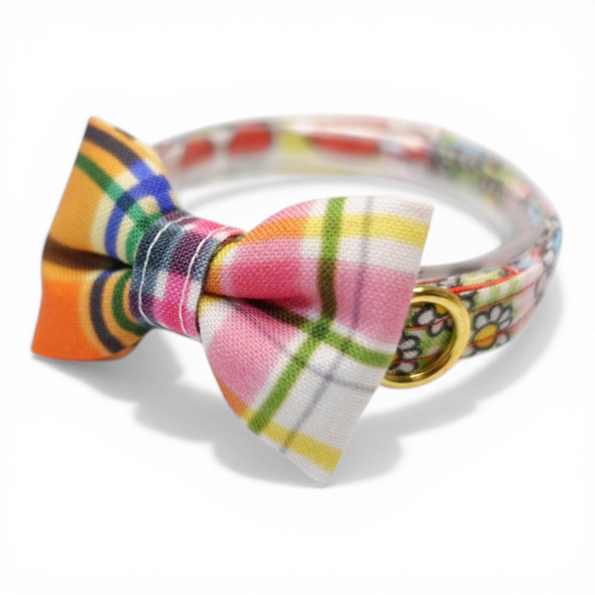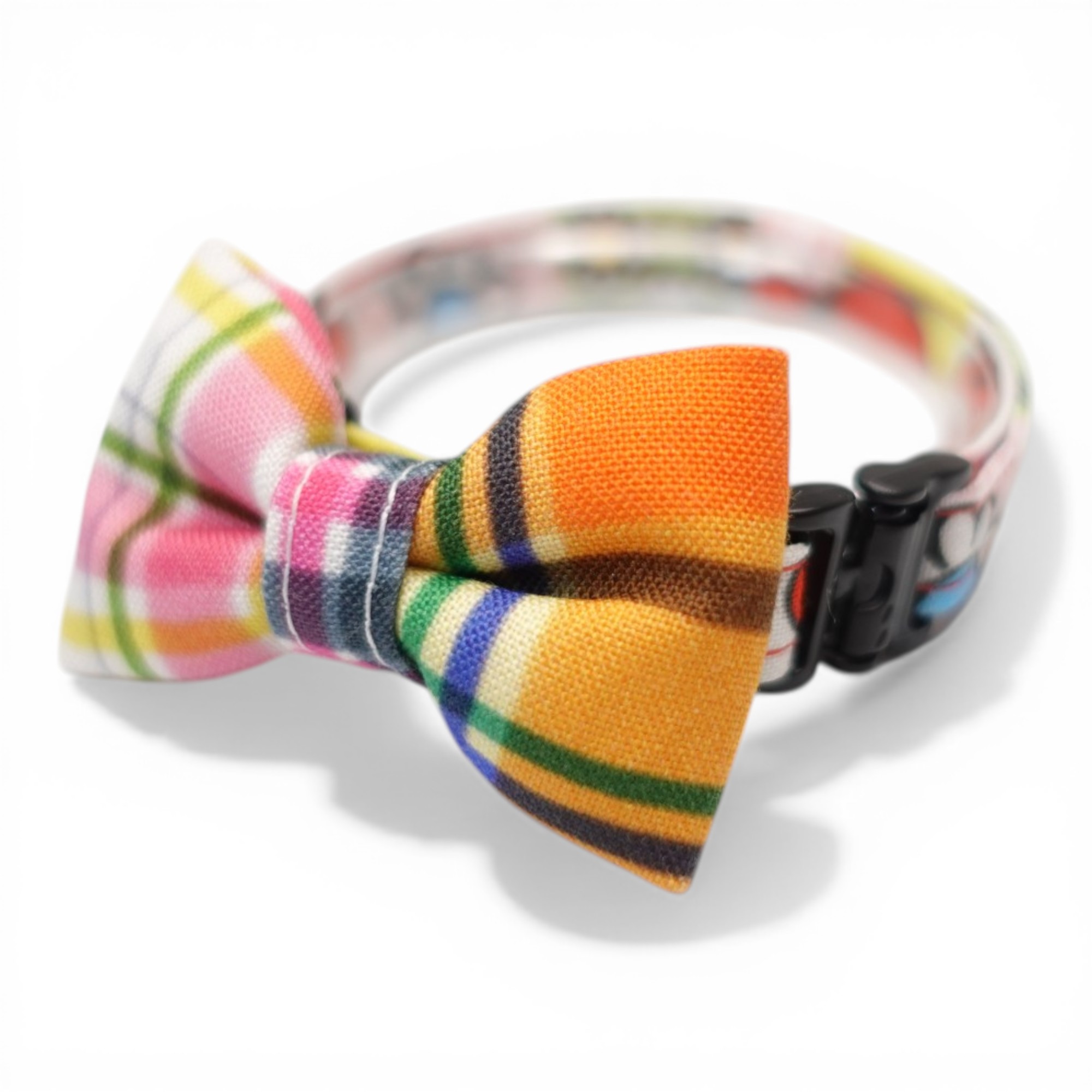 世界にひとつの組み合わせ|レトロリンゴ×手書きチェック 左右で柄が異なるリボン首輪【限定1点】M柄 [patchwork-13]